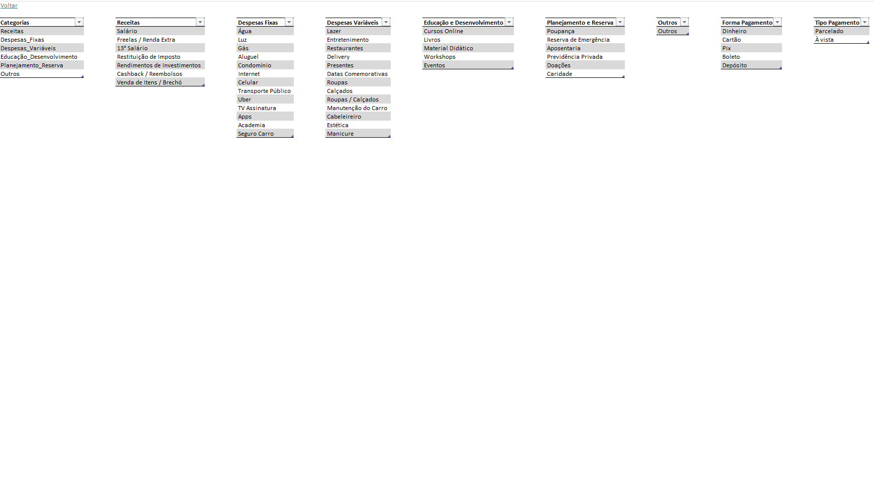Classifique seus gastos por categorias como mercado, moradia, saúde, educação e lazer, facilitando a análise mensal.