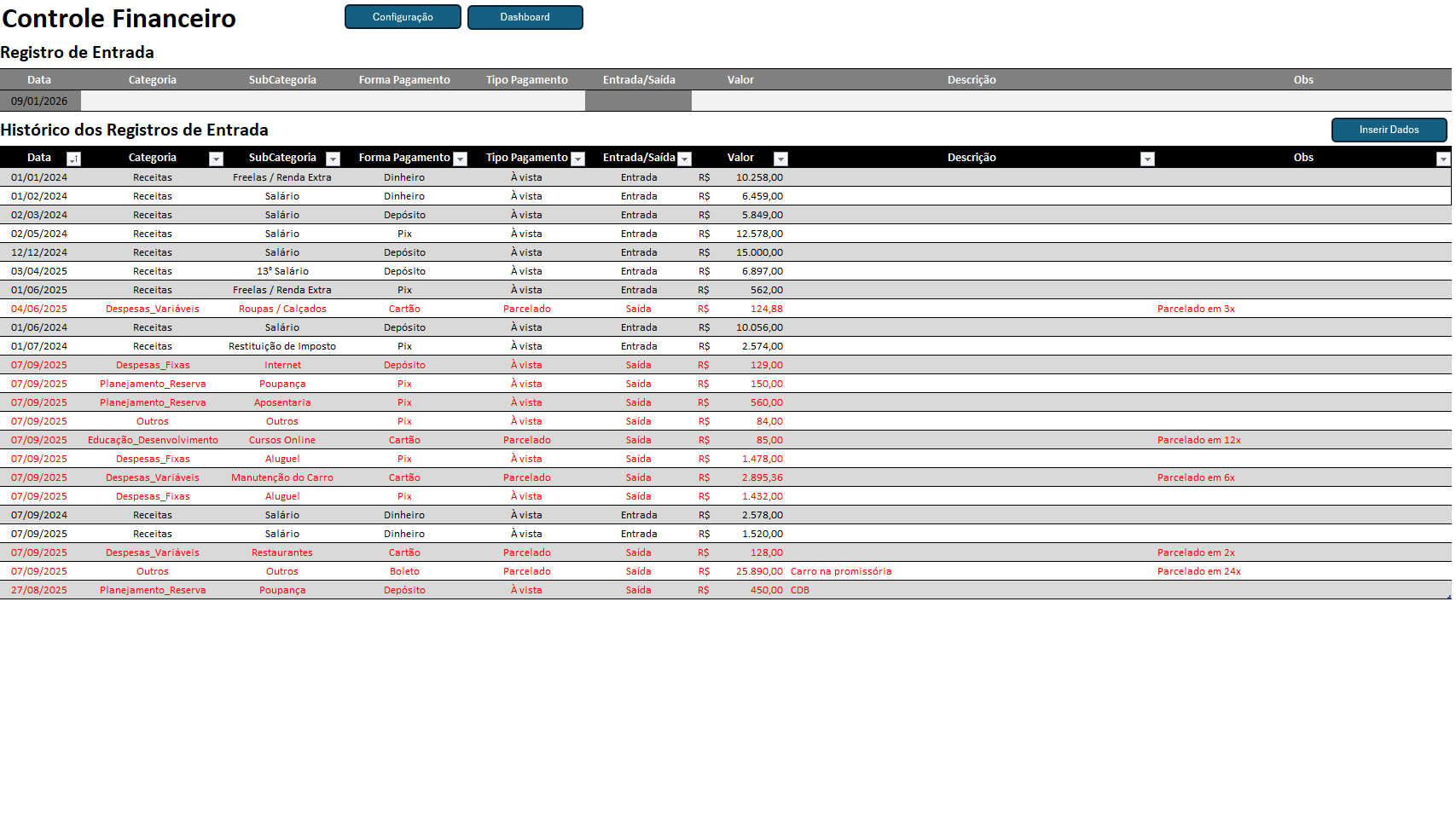 Planilha automatizada com cálculos, validações e filtros inteligentes que atualizam todas as informações automaticamente.