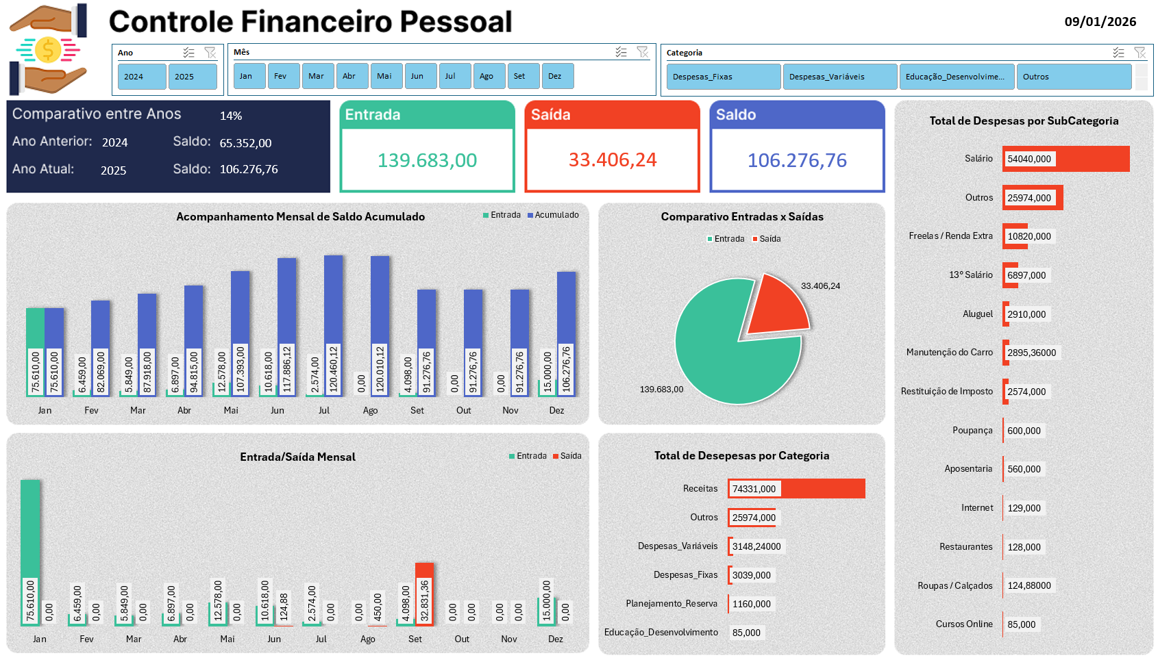 Planilha de controle financeiro pessoal, com registro simples de entradas e saídas, categorização automática de gastos, dashboard visual com indicadores, acompanhamento de saldo e metas financeiras, além de automação completa para facilitar o controle do seu dinheiro no dia a dia.