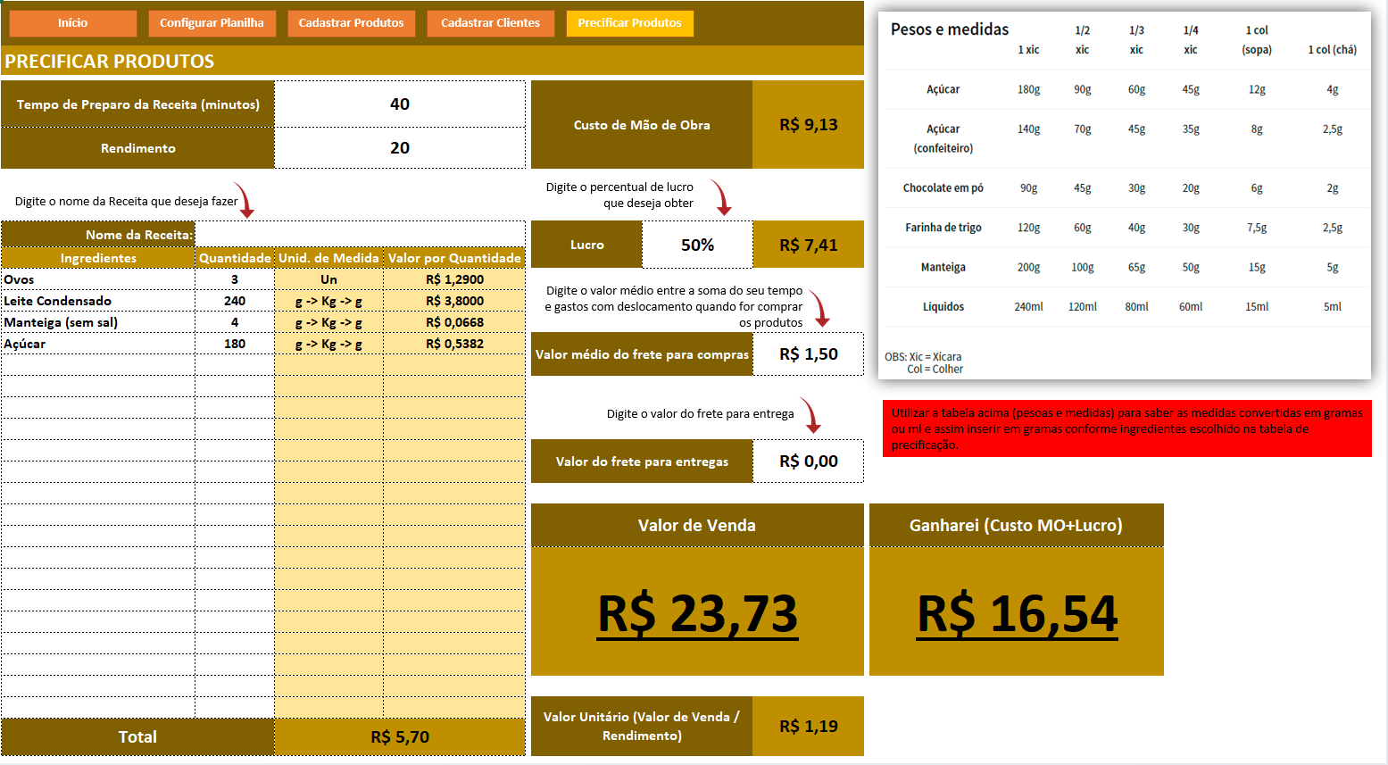 Planilha completa para precificação de produtos culinários, com guia de uso passo a passo, configuração de custos fixos e mão de obra, cadastro de ingredientes, insumos e clientes, cálculo automático do preço de venda e resumo financeiro por receita. Ideal para quem busca vender com lucro e controle financeiro na cozinha doméstica, delivery ou estabelecimento físico.