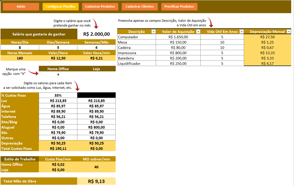 Defina seu salário base, custos fixos (cozinha doméstica, delivery ou estabelecimento físico) e depreciação de equipamentos, criando uma base sólida para a precificação.